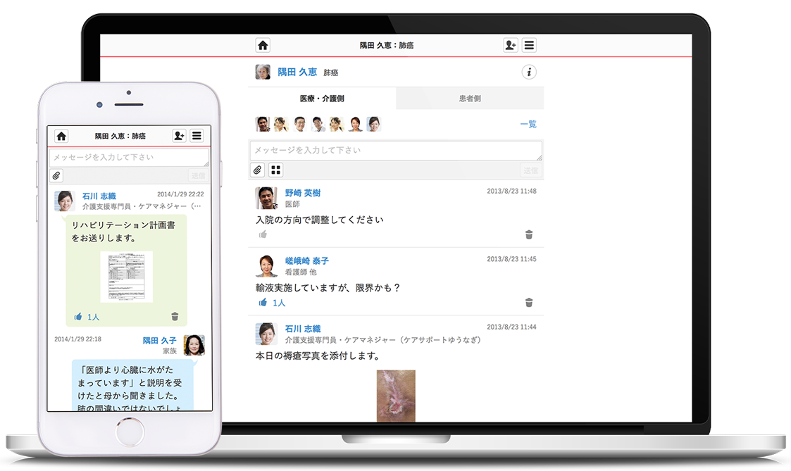 病院、クリニック、薬局、介護施設などで働く医療介護者の多職種連携や患者・家族とのコミュニケーションツールとして、全国の医療介護の現場でご利用いただいている「完全非公開型 医療介護専用SNS」です。